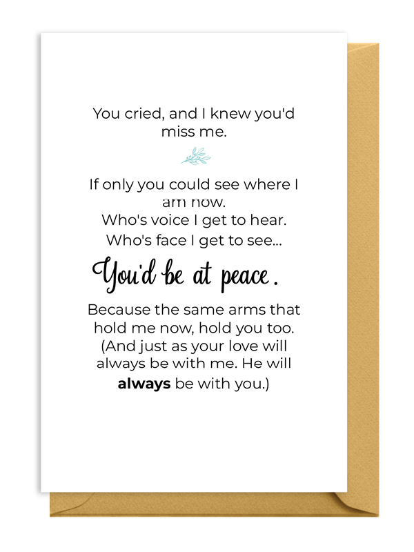 This comforting verse celebrates the love shared from the very first moment and offers reassurance after saying goodbye. A miscarriage or infant loss sympathy card that gently lets a grieving parent know their child is at peace and always connected.