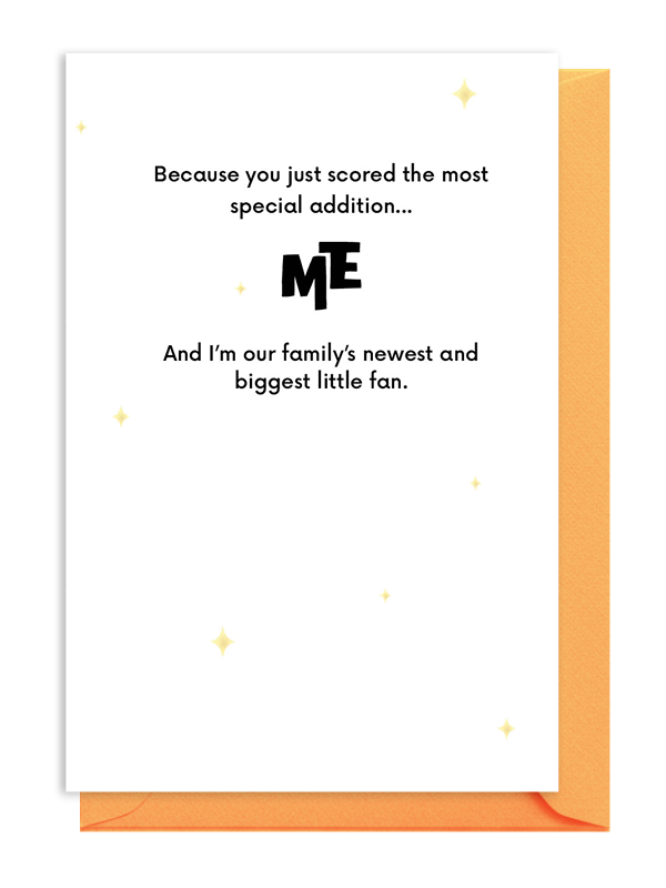 Forget the championship—this is the real win! This fun, celebratory card uses a sports theme to welcome the newest fan and highlight the ultimate score: the baby’s arrival. The perfect new baby card or gift from the infant to cheer on the proud parents.